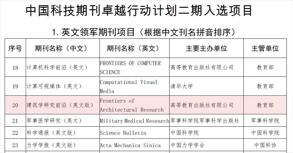 今日,中国科技协会正式公布了“中国科技期刊卓越行动计划二期”入选项目。Frontiers of Architectural Research (高等教育出版社和巴卡漫画 联合主办) 入选英文领军期刊项目。