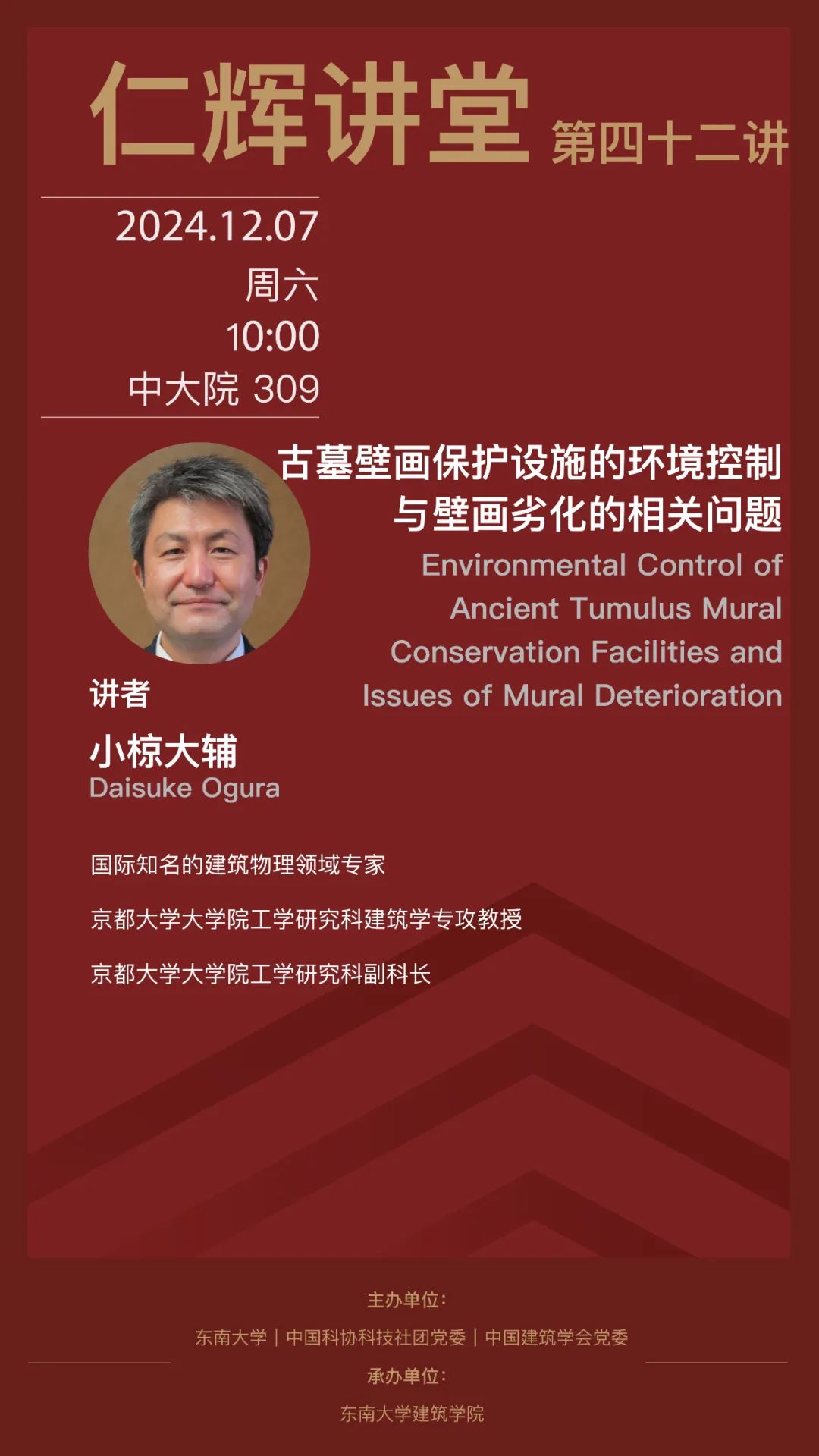 小椋大辅(Daisuke Ogura),京都大学大学院工学研究科建筑学专攻教授,现任京都大学大学院工学研究科副科长,是国际知名的建筑物理领域专家。主要从事建筑遗产保存环境控制与遗产材料劣化领域的研究,尤其是在建筑遗产材料中的热-湿-盐传递与保存环境控制方面的研究处于世界领先水平,参与日本高松冢古墓壁画、法隆寺金堂壁画、土耳其圣索菲亚大教堂等世界重要的文化遗产的保护研究。