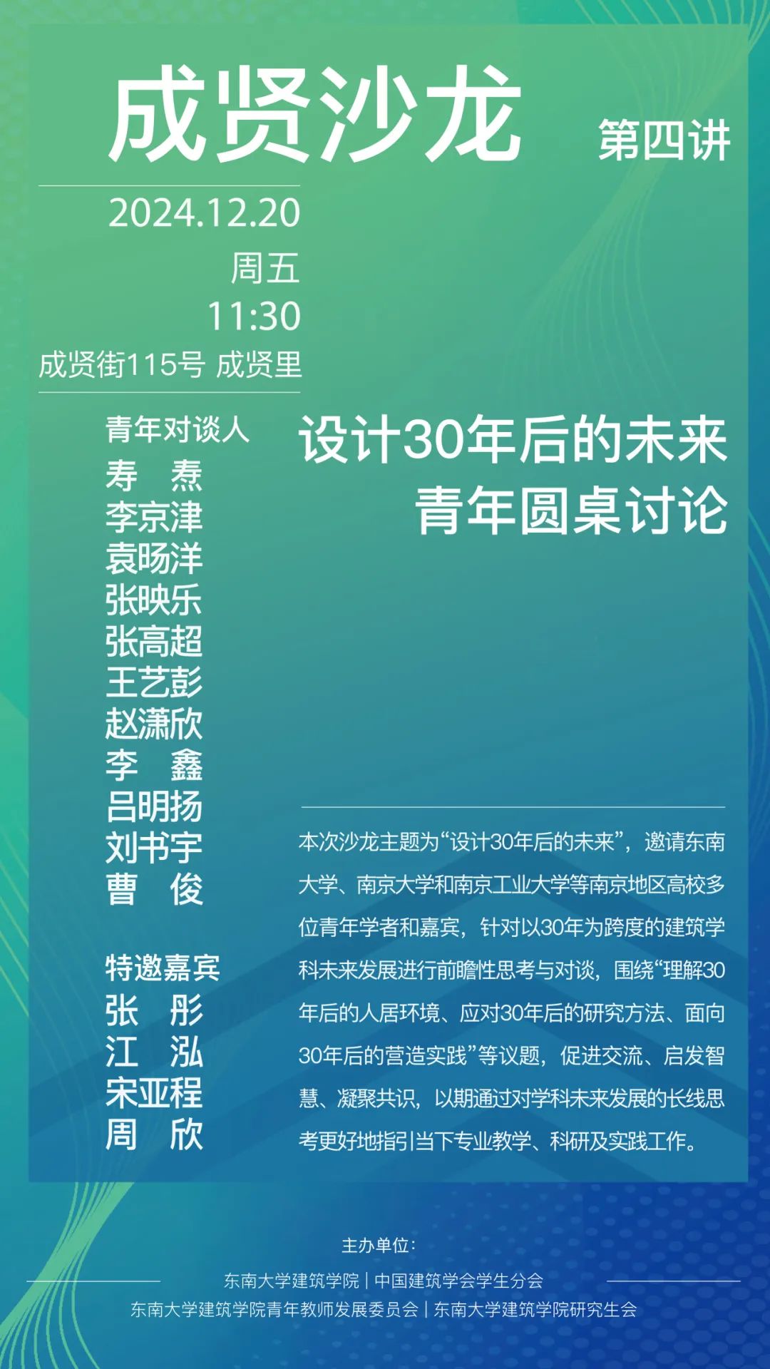 成贤沙龙,期待青年学者们展示才华、交流思想、共同成长;期待跨越学科边界,探索城乡建筑环境与人、自然、社会之间的复杂关系;期待在快速变化的世界中,共同寻找建筑学科的无限可能与全新价值。