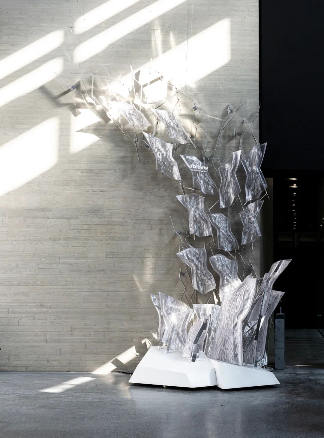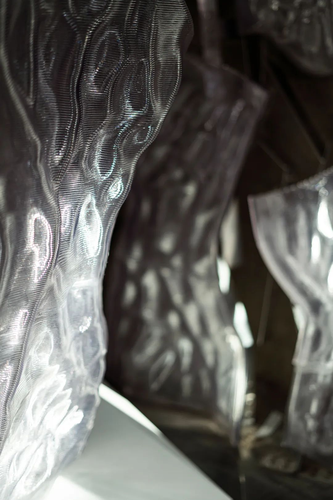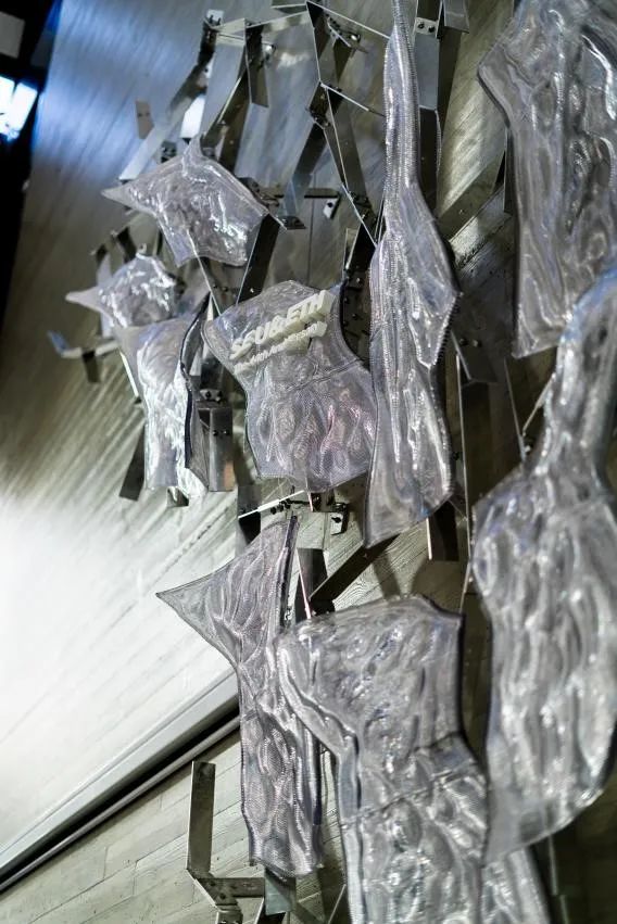 装置的整体形态如同自然冰川的透明质感与藤蔓生长的有机形态交织,透过金属框架与透明材料的协调应用,形成了一种在光影作用下晶莹剔透的视觉效果。光线穿梭于装置内部,映射出流动且多层次的空间体验,赋予其独特的动感与张力。金属骨架自地面向上生长,沿墙面蔓生延展,其结构形态既体现了运算化技术的精密逻辑性,又融入了自然肌理的细腻纹理,呈现出一种生物动态生长的审美倾向。透明板材覆盖骨架表面,其复杂肌理与光影互动,通过反射和折射回应周围环境的变化,形成多层次、动态流动的空间体验。