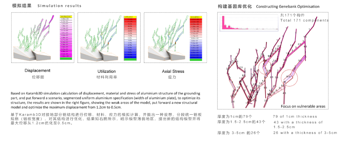 其中,金属框架由315个铝制构件组成,主结构铝构件分为标准原型件和定制连接件。框架结构生成过程中,采用多层级多智能体算法,通过自下而上行为实现结构闭环,并生成高效一体化的建图流程。项目还使用Karamba3D等结构性能计算工具,通过回溯与进化算法优化框架与墙面连接件的布局,实现材料利用率和结构应力性能的全局优化。