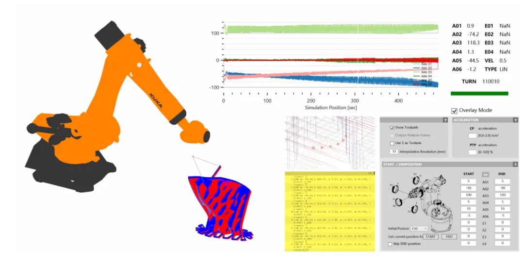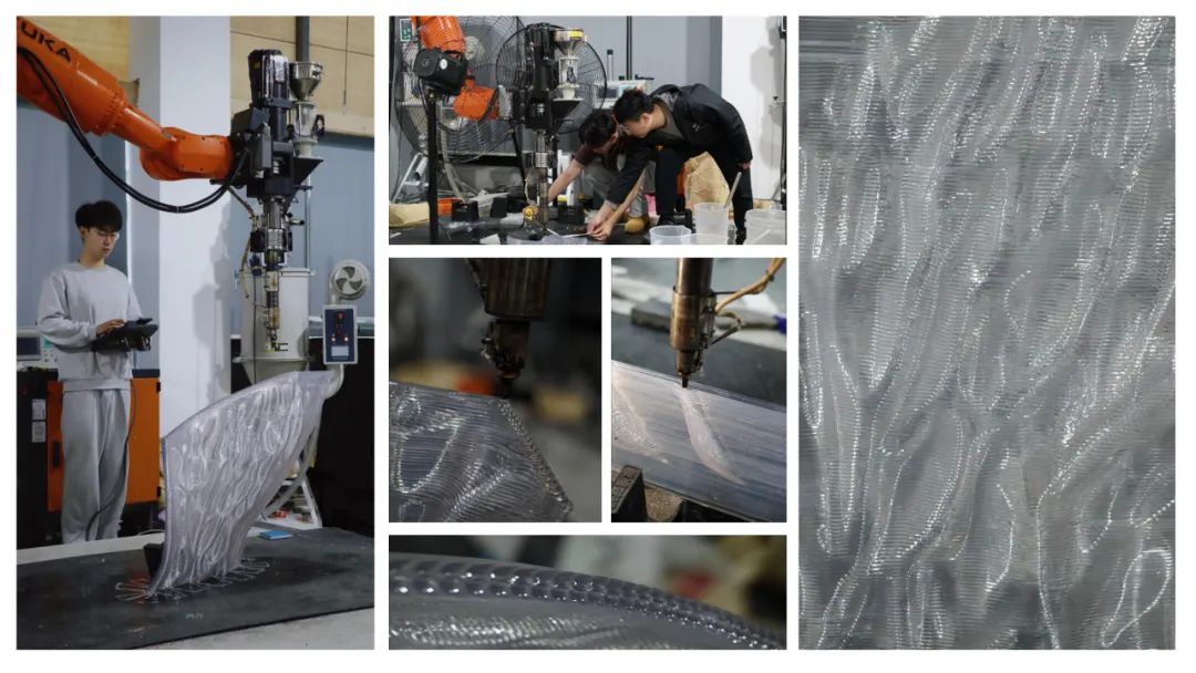 项目使用KUKA六轴机械臂增材打印环保塑料材料(PETG),打印了44块具有定制复杂肌理的半透明面板。通过拓扑优化与数字建造参数调整,解决了中空打印、悬挑打印等核心问题。结合一系列建造实验,项目优化了打印参数并开发了相应的几何控制算法,确保了建造过程的安全性和高精度打印效果。