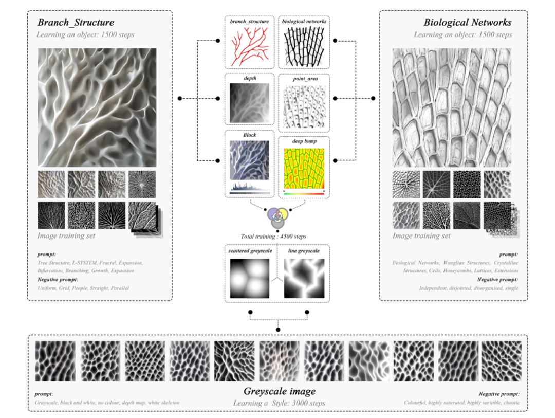 设计团队通过选取风格图像样本,提取几何特征并离散化为二维设计原型,并基于多段线映射算法,调整线段长度生成拓扑统一且形态多样的曲面,以实现3D打印外轮廓的精确控制。设计中采用流体集群智能算法,随机分布设计元素,形成复杂且有序的流体结构。在纹理细节上,通过生成式AI学习生物肌理形态,生成灰度图并映射为可编辑三维模型。通过训练自主机器学习模型调校和触发词权重调整,实现设计意图的精准表达,并适配机械臂增材制造。