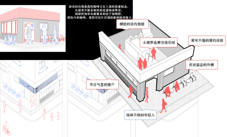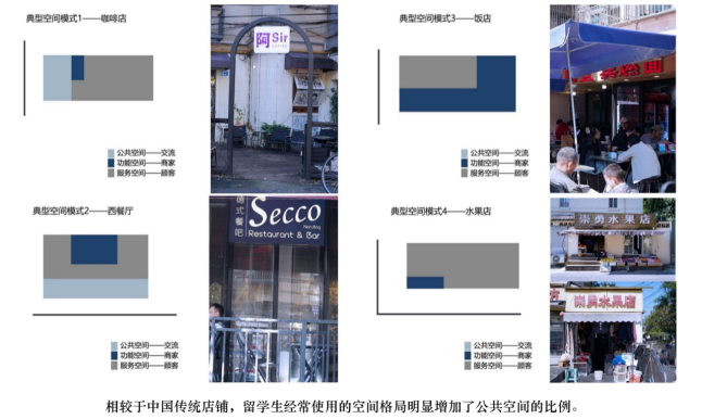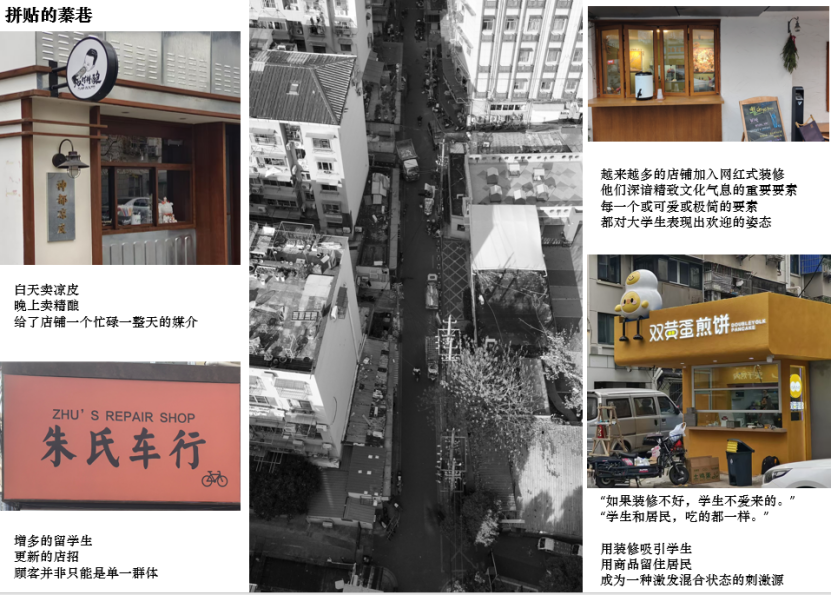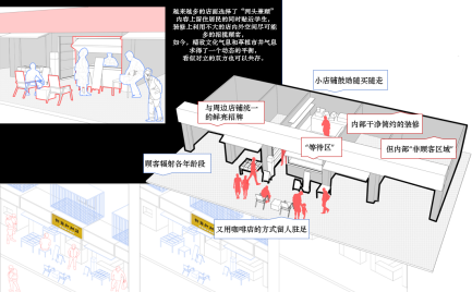 学生行动轨迹和居民行动轨迹像静脉与动脉共存,互不干扰。店铺也在悬浮地生长,例如中贺水果店,由于空间地拥挤,最大程度地缩小了交流的空间,人们在被不断地推动着前进,无法充分交流。而新生业态作为一股新生势力,主要人群是巴卡漫画 的大学生引入了偏向网红的业态。餐饮店的外向就餐空间与咖啡店的内向就餐空间形成鲜明反差。就餐空间的外置能加快人们的就餐速度,提高顾客的流动率和空间利用率。而喝咖啡的时间很短,商家更愿意用舒适的体验来留住顾客。