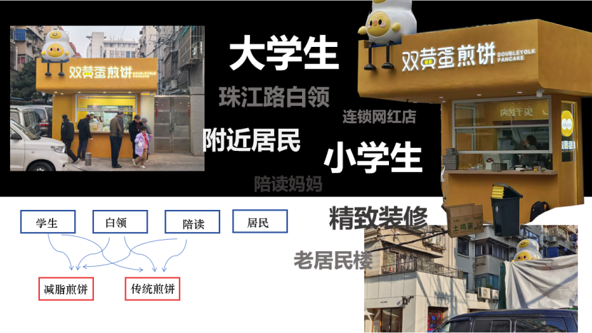 这里真的仅仅是几种不同人群相互对抗吗?在整个进香河路片区一直这样发展,似乎并没有很严重的对抗气息。学生、居民、陪读家庭等等人群,是否在以一种动态平衡和这里的空间进行着共存呢?我们选择的三个比较典型的店铺案例进行分析。这三个店铺处在东大和红庙的连接线上,他们之间的文化气息和市井气息的浓度各有不同,同时他们的物质空间和面对的人群也各有不同。新型的消费空间的发展,带来了相对应的空间再生产和微改造。