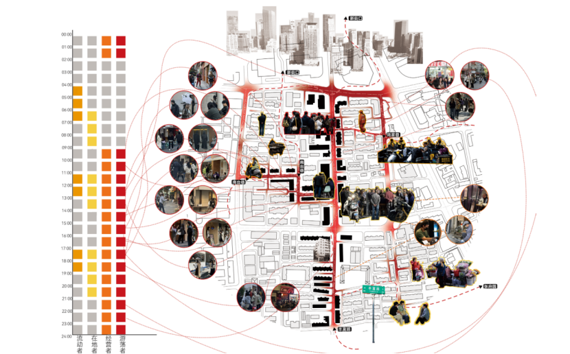 进香河路鲜活在每一个烟火升腾的瞬间集贸市场似乎成为原点承载着烟火的盛放。然而在这表象的背后仍然有着交错混杂的种种“矛盾”。原住民的锚固与陪读家庭的浅居是这个场地的重要反差特征。前者借由买菜作为一天中的社交仪式,在街道角落驻足聊天,后者大多用电动车接送,并不在此停留过久。不同的身份塑造了不同的生活节奏,不同的生活节奏又影响着不同的物质空间。原住民的锚固进一步加强了适合于他们的物质空间环境,陪读家庭的浅居间接导致了儿童业态的缺失。