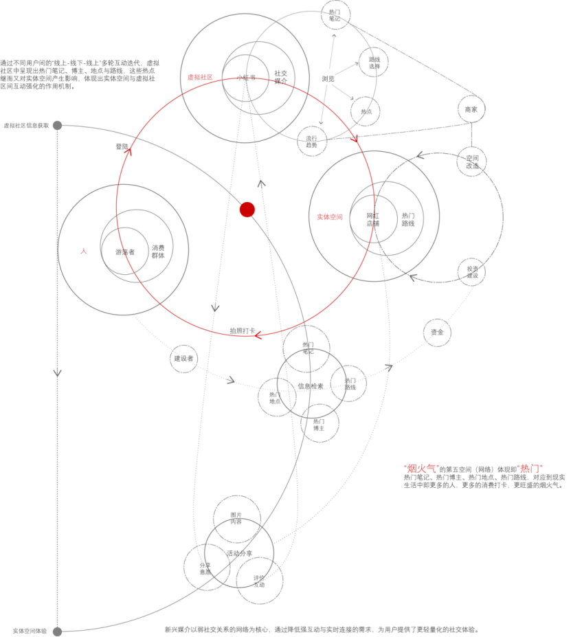 在丰富路内,人群分化为在地的居民,经营店铺的经营者与穿梭不停的“游荡者”,通过不同用户之间的“线上-线下-线上”的多轮互动迭代。虚拟社区中呈现出热门的笔记、博主和路线,这些热点继而又对实体空间产生印象,体现出实体空间与虚拟社区互动强化的特征。“游荡者”成为了网红街区内的“媒介动物”,通过打卡上传线上社群,为丰富路与南台巷的标签增添了大量具有传播效能的附加信息。在这个过程中,传统城市空间的注意力法则不再适用,在这样媒介激增、注意力饱和的环境下,关键问题不再是”发出声音,而是如何在每个人都发声的“人声鼎沸”中被听到。