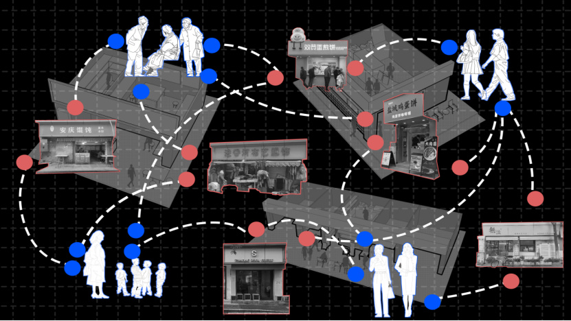 在这种传播机制下,城市的再生产呈现出一种拼接的过程。街区的烟火气正是在热点与日常的交替中不断被重新拼接与书写。点状生成:热点是烟火圈的引爆点,它吸引外界目光,将空间的某个节点转化为焦点。线状连接:热点通过空间流动和传播效应连接日常场域,将更多人群引入生活实践的路径中。面状扩展:热点与日常相互作用,烟火气从局部蔓延至整体,形成街区整体的活力。