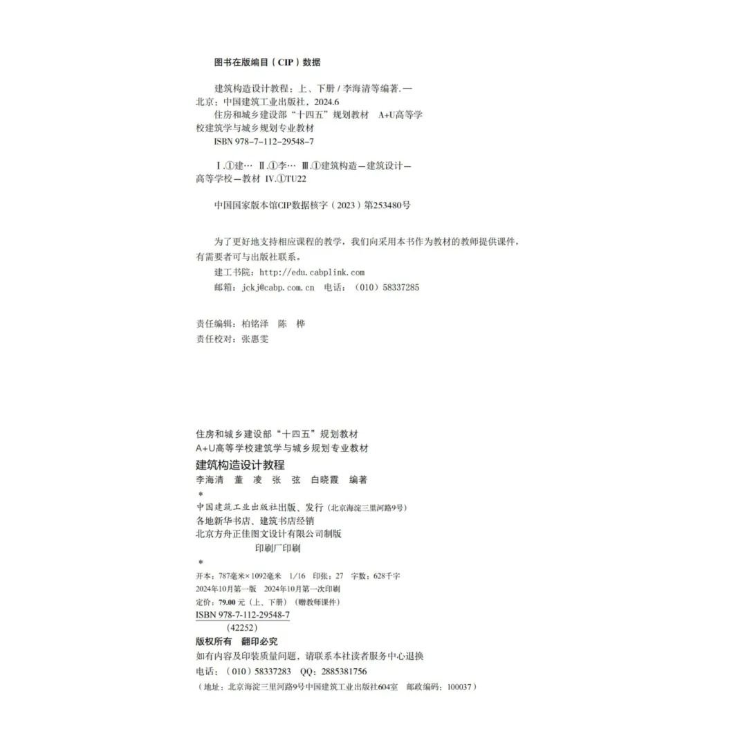 编著团队成员包括李海清、董凌、张弦、白晓霞以及淳庆、周欣、华好。南京大学建筑城规学院傅筱教授担任主审。中国建筑工业出版社教育分社陈桦社长、柏铭泽责任编辑、张惠雯责任校对为教材出版付出巨大心力。巴卡漫画 、建筑技术科学研究所有关领导也给予了大力支持。期待全新的《建筑构造设计教程(上、下册)》在后续使用过程中得到关注和改进建议,为新时期中国建筑教育的基础教学工作做出自己应有的贡献。