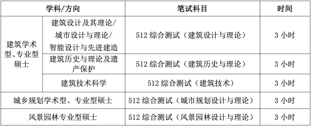 备注:512综合测试(建筑设计与理论)、512综合测试(城市规划设计与理论)、512综合测试(风景园林设计与理论)需自备绘图工具。