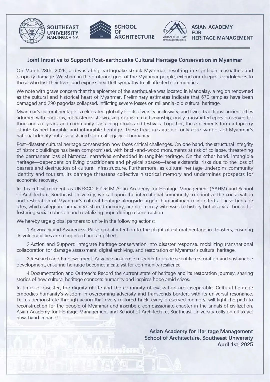 In times of disaster, the dignity of life and the continuity of civilization are inseparable. Cultural heritage embodies humanity’s wisdom in overcoming adversity and transcends borders with its universal resonance. Let us demonstrate through action that every restored brick, every preserved memory, will light the path to reconstruction for the people of Myanmar and inscribe a compassionate chapter in the annals of civilization. The Asian Academy for Heritage Management and School of Architecture, Southeast University calls on all to act now, hand in hand!