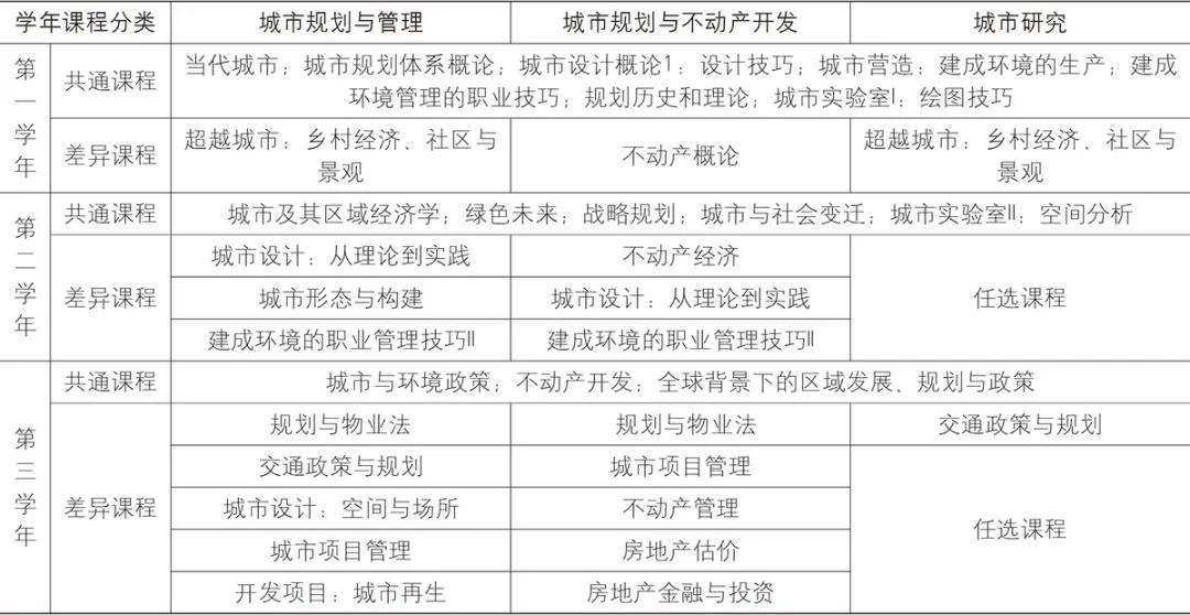 以英国伦敦大学学院(UCL)巴洛特规划学院为例,该学院共有三个城市规划本科项目,分别为城市规划设计与房地产、城市规划与城市管理、城市研究;这三个专业分别对应地产开发、城市管理和城市研究三个就业方向。在课程设置上,三个方向的80%的课程均保持一致,其余20%的课程则围绕这三个方向展开(表2)[14]。