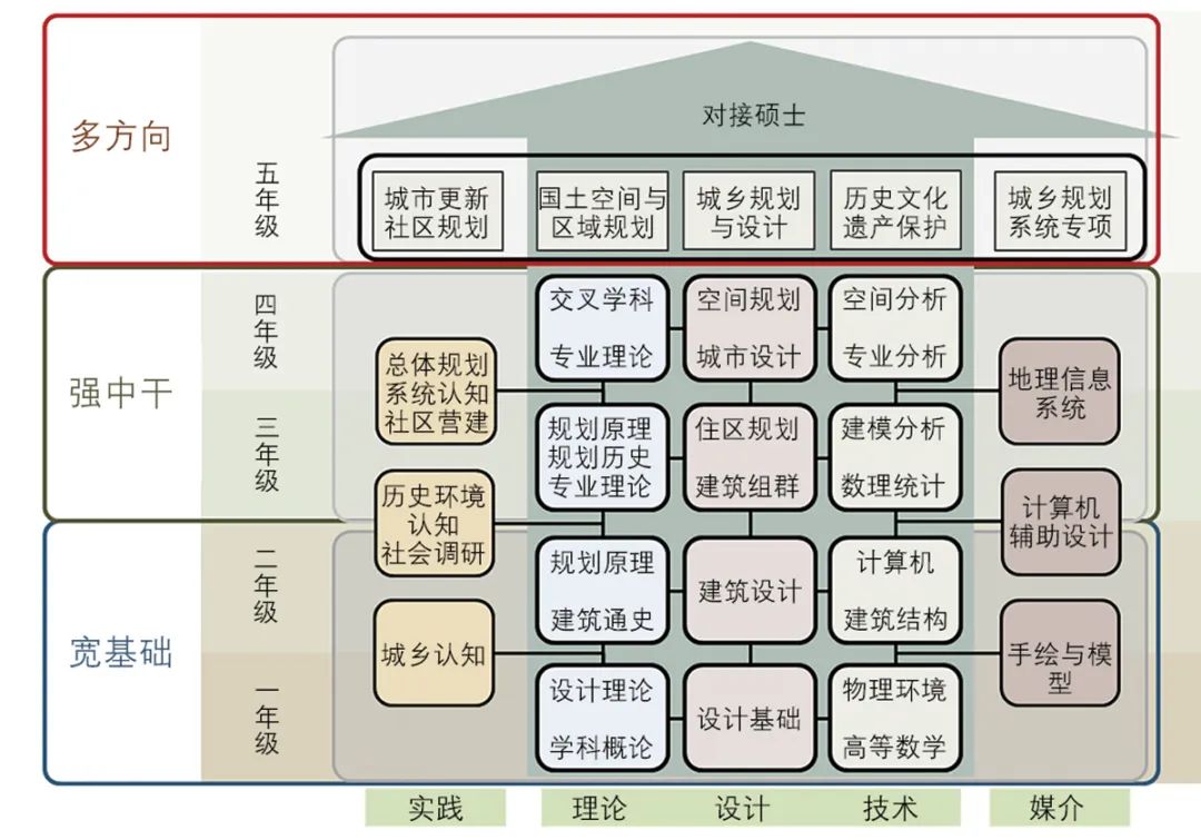 在此基础上,经过广泛研讨形成了新的培养方案,培养方案强化了以下特点:第一,强化立德树人,建设思政专业;城乡规划专业有着鲜明的家国情怀特征,思政建设不应局限于单一课程,而是贯穿专业培养的全过程;第二,突出“宽基础”“强中干”“多方向”的培养路径(图3)[4]。其中“宽基础”强调城乡规划学科与建筑学、风景园林学共建三个一级学科的设计基础、理论基础和技术基础,包括设计基础、建筑通史等课程;“强中干”则突出城乡规划的学科主干,在原有设计与理论双主线的基础上,加强设计与理论、技术之间的融合;“多方向”则是对接硕士培养的二级方向,强化与城乡规划学各二级学科方向的衔接。本轮培养方案的修编,在上一阶段强调设计、理论并重等基础上,突出了城乡规划学科“空间”的核心地位,围绕“空间+理论”“空间+技术”“空间+实践”展开了一系列的课程群建设。