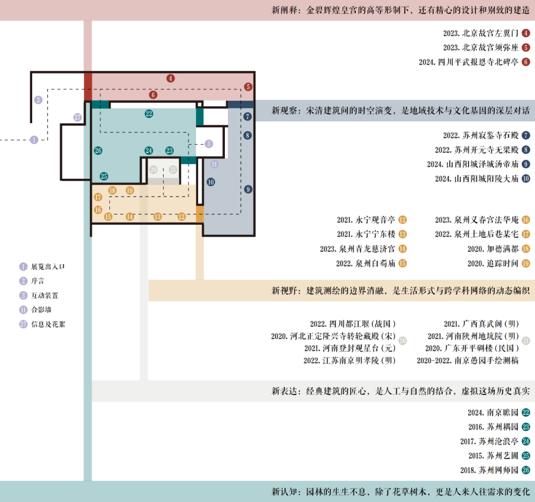 “新阐释·官式新解”板块由贾亭立老师导览,深挖官式建筑的设计巧思;“新观察·宋清之间”板块由白颖老师导览,展现地域建筑的时空演变;“新视野·生活形式”板块由赵越老师导览,探索建筑承载的生活与仪式;“新表达·数字空间”板块由陈薇老师和贾亭立老师导览,聚焦经典建筑的数字化呈现;“新认知·旧园新知”板块由是霏、邵星宇和赵越3位老师导览,对比园林的古今变化。展览全方位展现了2019-2024年建筑测绘的丰富成果与多元视角。