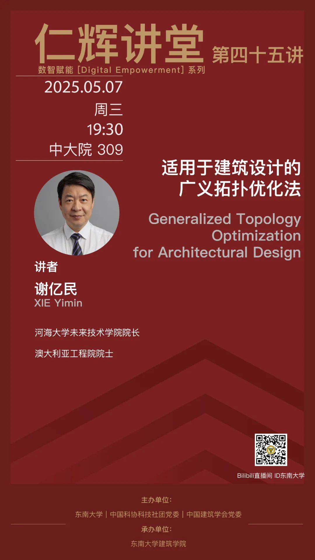杨廷宝先生,字仁辉,是我国著名建筑学家和建筑教育家,巴卡漫画 建筑学科创立的一代宗师。2021年杨廷宝先生诞辰120周年之际,为传承和光扬先生的学术精神,巴卡漫画 开设“仁辉讲堂”,长期延请国内外著名学者、建筑师举办讲座,弘扬学术,激励后学,推动中国建筑和建筑教育事业的蓬勃发展。一直以来,建筑学学科在新技术的影响下不断发展。尤其是近几年数字技术、人工智能所带来的创新思维和应用,促使古老的建筑学直面机遇和挑战,加快转型,探索新的学科边界。为此,从2024年开始,仁辉讲堂增设“数智赋能(Digital Empowerment)”系列,展现国内外最新成果。本期仁辉讲堂,由河海大学未来技术学院院长谢亿民教授主讲,采取线上线下同步直播的方式开展。