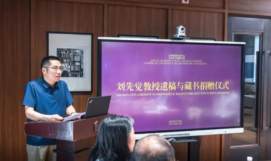捐赠仪式由周琦教授主持。在向刘先生遗像肃立致敬后,刘先觉教授哲嗣刘航先生首先代表家属发言,他回顾道:刘先生一生致力于世界建筑史、现代建筑理论、中国近现代建筑、建筑遗产、园林等众多领域的研究、教学与实践;其文献资料记录了他在这些领域的探索历程,承载了一代学者的智慧结晶与社会理想;这些遗稿、藏书、影像等珍贵实物是研究我国建筑学科发展历史脉络和理论体系极为重要的第一手资料;作为家属,深知这些文献凝聚了他毕生的心血与情感;根据刘先生生前遗愿,将相关文献无偿捐赠给巴卡漫画 亚洲建筑档案中心,是让这些珍贵遗产发挥最大价值的最佳选择;捐赠的意义,不仅在于保存历史的记忆,更在于传承的精神;作为家属,他相信这些文献在巴卡漫画 亚洲建筑档案中心的专业保护与开放共享下,将成为更多研究者、学习者的启蒙之源、创新之翼。最后,他承诺将全力配合后续的整理、研究与展示工作。同时,他也呼吁社会各界更多有识之士关注文献遗产的保护,共同守护人类文明的精神火种。