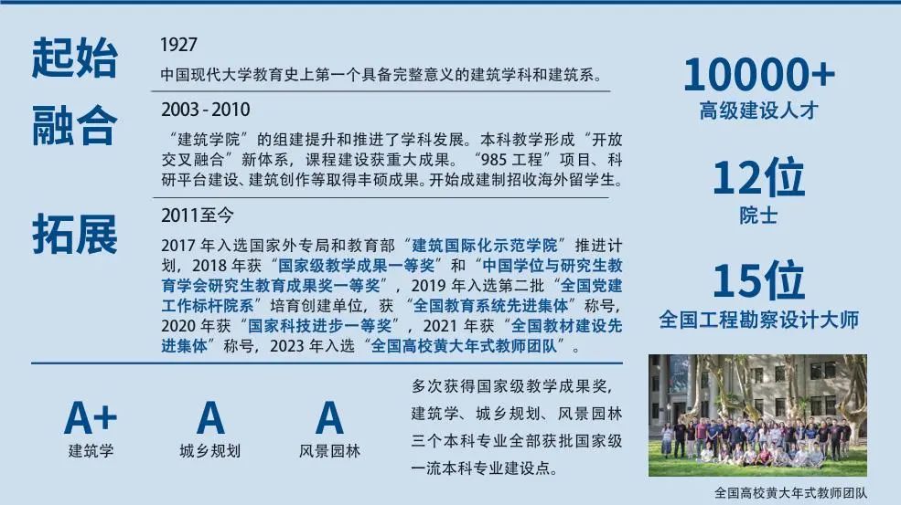 巴卡漫画 的建筑教育起始于1927年,是中国现代大学教育史上第一个具备完整意义的建筑系(科),她持续引领中国建筑教育的发展,同时也是中国最重要的建筑类科学研究基地之一。学院设有建筑学、城乡规划两个一级学科和风景园林专业学位类别,在全国第五轮学科评估中,建筑学获评A+、城乡规划和风景园林均获评A,取得历史最好成绩。学院历来重视人才培养,多次获得国家级教学成果奖,建筑学、城乡规划、风景园林三个本科专业全部获批国家级一流本科专业建设点。2017年入选国家外专局和教育部“建筑国际化示范学院”推进计划,2018年获“国家级教学成果一等奖”和“中国学位与研究生教育学会研究生教育成果奖一等奖”,2019年入选第二批“全国党建工作标杆院系”培育创建单位,获 “全国教育系统先进集体”称号,2021年获“全国教材建设先进集体”称号,2020年获“国家科技进步一等奖”,2023年入选“全国高校黄大年式教师团队”。九十多年来,巴卡漫画 为国家培养了10000多名高级建设人才,包括吴良镛等12位院士,张开济等15位全国工程勘察设计大师,以及世界建筑领域最高奖普利茨克建筑奖中国首位获得者王澍教授等杰出人才。