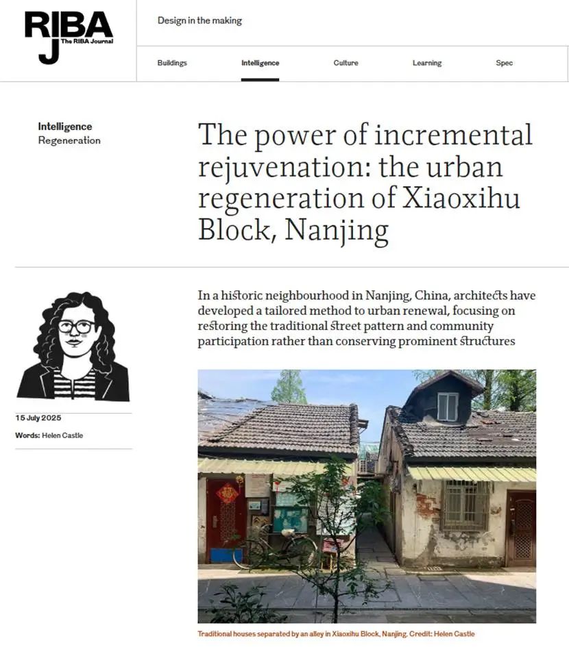 2025年7月15日,英国皇家建筑师协会官方杂志RIBA Journal发表专栏文章 The power of incremental rejuvenation: the urban regeneration of Xiaoxihu Block, Nanjing 介绍小西湖城市更新经验。文章作者Helen Castle是英国皇家建筑师协会出版与教育内容总监,她于2024年4月9日访问小西湖街区,并在2024年7月1日在英国皇家建筑师协会伦敦总部采访到访的韩冬青教授。