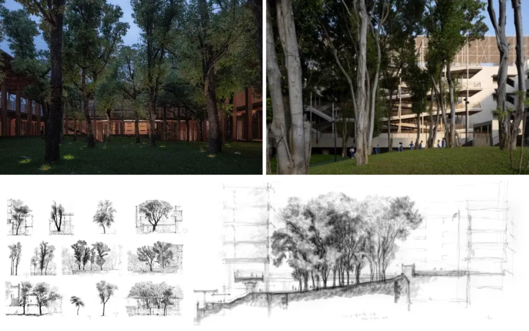在捐赠作品中,“景德镇川上行” 项目坐落于景德镇陶溪川工业遗产保护更新片区,围绕树木的宁静院落在新的建筑秩序中,新旧交融,一种历史感由此生发。“深圳荔园外国语小学(景田)” 项目为守护城市化进程中保留的一片小森林,创造性地采用了垂直立体校园设计,为高密度城市空间打造了新型校园建筑典范。这些过程图纸与模型是建筑研究中极为关键的组成部分,将共同为建筑教育与学术研究提供极具价值的参考资料。