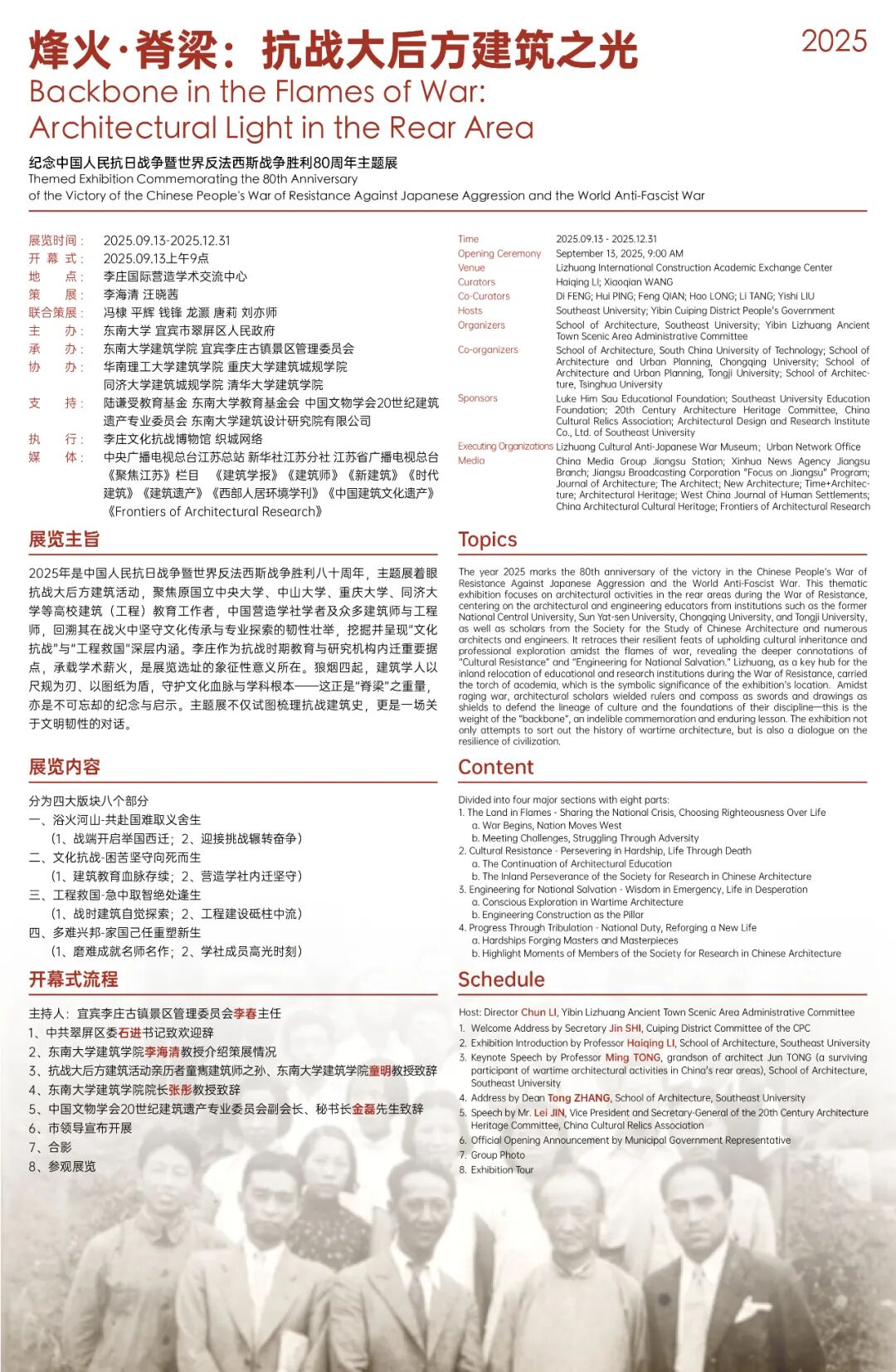 The "Backbone in the Flames of War: Architectural Light in the Rear Area - Themed Exhibition Commemorating the 80th Anniversary of the Victory of the Chinese People's War of Resistance Against Japanese Aggression and the World Anti-Fascist War", jointly hosted by Southeast University and the Yibin Cuiping District People's Government, will be grandly unveiled on September 13, 2025, in Lizhuang Ancient Town, Cuiping District, Yibin City, Sichuan Province. The 3rd Forum on Modern Architectural History and Theory, titled "Construction and War", hosted by the Southeast University School of Architecture and the Lizhuang Ancient Town Scenic Area Management Committee, will also be held concurrently.This event is the opening of the Southeast University School of Architecture's "A Century in Review and Prospect" series of academic activities. It invites renowned scholars and individuals from home and abroad to join this grand occasion and will be live-streamed online throughout.