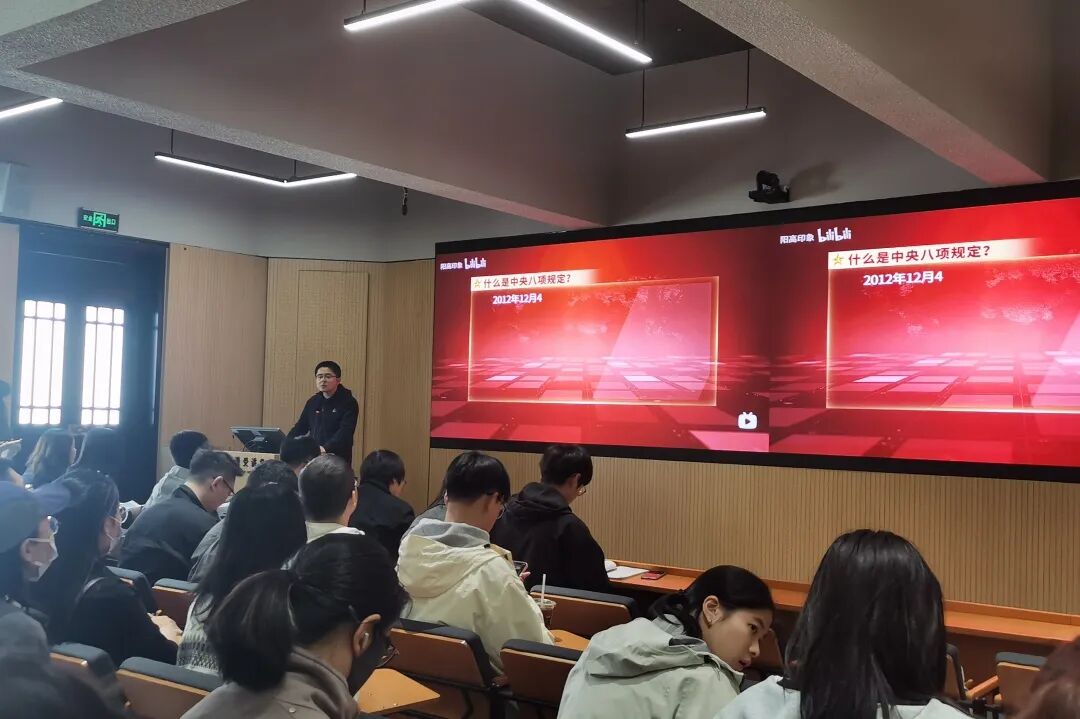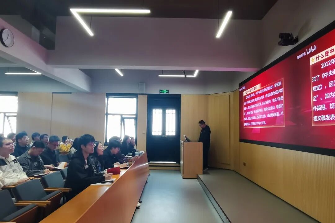 最后,学院党建思政联系人奚月林老师对本次党课学习进行了总结,强调党的作风就是党的形象,关系人心向背,决定党和国家事业成败。作为青年党员,我们应当牢记中央八项规定精神,时刻约束自己、端正自己,以良好作风为推动中国式现代化贡献智慧和力量。