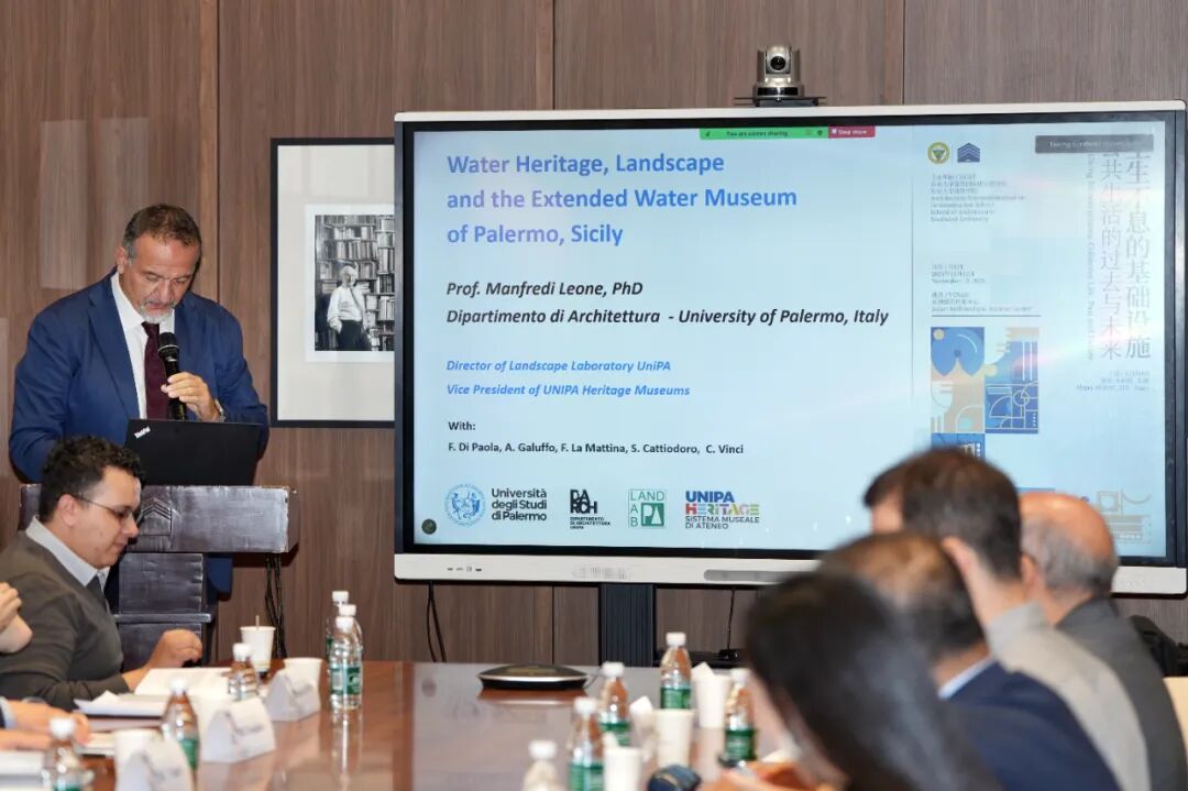 第一位演讲者意大利巴勒莫大学Manfredi Lenone副教授以《西西里巴勒莫的水文化遗产、水体景观及延伸的水博物馆》为题,介绍了巴勒莫通过修复和景观设计重建历史水景观的努力。他着重阐述了如何将源于阿拉伯的水系统重新整合到公园和博物馆项目中,从而在文化遗产与城市生态更新之间建立连接。