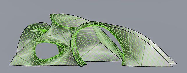 This design is based on parabolic hyperboloid. As double curved and double ruled surfaces, hyperbolic paraboloids (hypars) allow for designing efficient structures to resist loads through forms and ensure a relatively easy construction method. Additionally, the various combinations of hypars could represent an effective operation for generating architectural forms that are able to respond to diverse spatial and programmatic necessities. Hypar-Based Form Making Method is developed to combine individual hypars into free-bending smooth surfaces which meanwhile envelope various architectural spaces. Hypar pavilion is a prototype designed with this form-making method. It is a grid shell combined from 40 hypars and fabricated with aluminum cubes and cables. It shows architectural spatial potentials and structural rigidities of shells designed with this form-making method.