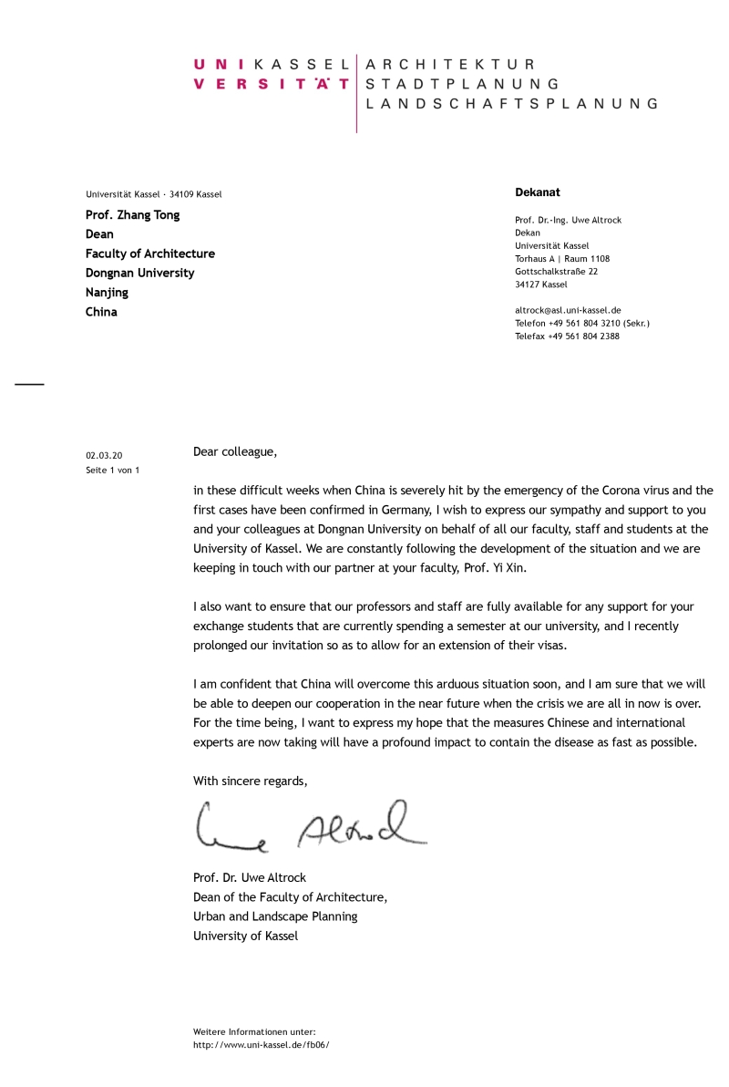 A letter from the school of architecture of Kassel University in Germany supporting the fight against the new coronavirus