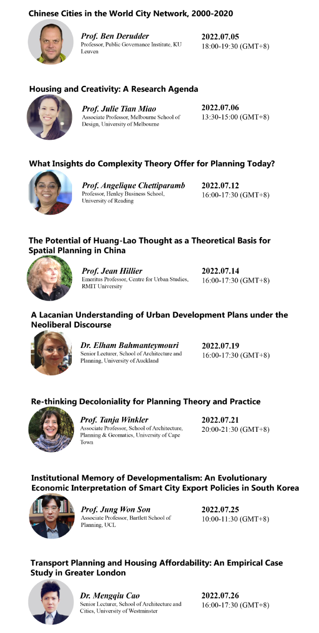 Overview Planning theories and methods are an important source of critical thinking in the planning discipline. This summer school course will invite 8 well-known international scholars to deliver various topics in the current frontier issues in planning research. It aims to help senior undergraduate and graduate students to keep up with the cutting-edge scholarship of international planning and improve their ability of critical thinking and writing.Online Lectures and Tutorials will be held between 5th July -26th July 2022. Students who are interested in the subject are welcome to register for free!