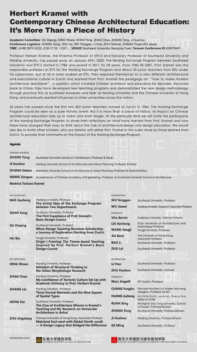 An academic event to be held on June 26, 2022, Sunday, in Nanjing as a tribute to Prof. Herbert Kramel’s contribution to Chinese Architectural Education, co-organized by Southeast University and Nanjing University.