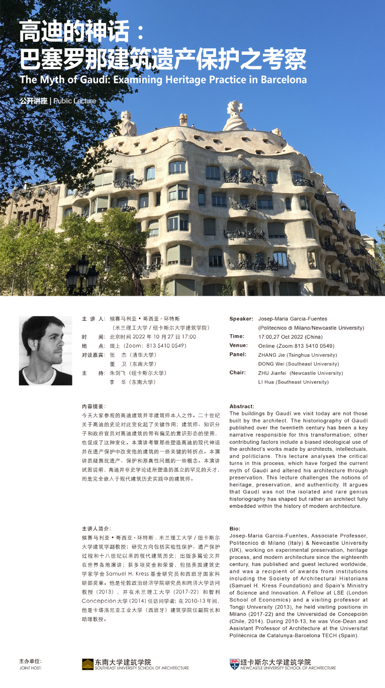 The buildings by Gaudí we visit today are not those built by the architect. The historiography of Gaudí published over the twentieth century has been a key narrative responsible for this transformation; other contributing factors include a biased ideological use of the architect’s works made by architects, intellectuals, and politicians. This lecture analyses the critical turns in this process, which have forged the current myth of Gaudí and altered his architecture through preservation. This lecture challenges the notions of heritage, preservation, and authenticity. It argues that Gaudí was not the isolated and rare genius historiography has shaped but rather an architect fully embedded within the history of modern architecture.
