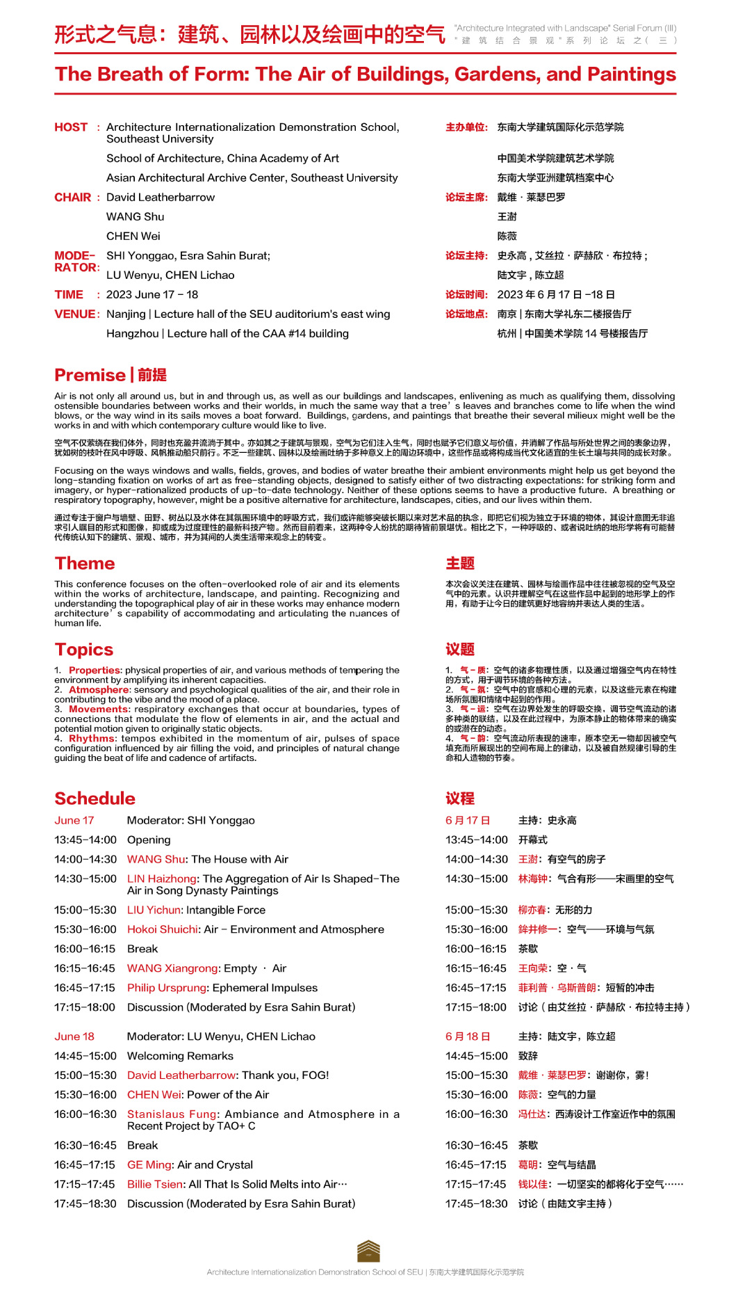 “Architecture Integrated with Landscape” Serial Forum (III)The Breath of Form: The Air of Buildings, Gardens, and PaintingsArchitecture Internationalization Demonstration School, Southeast UniversitySchool of Architecture, China Academy of ArtAsian Architectural Archive Center, Southeast UniversityDavid Leatherbarrow