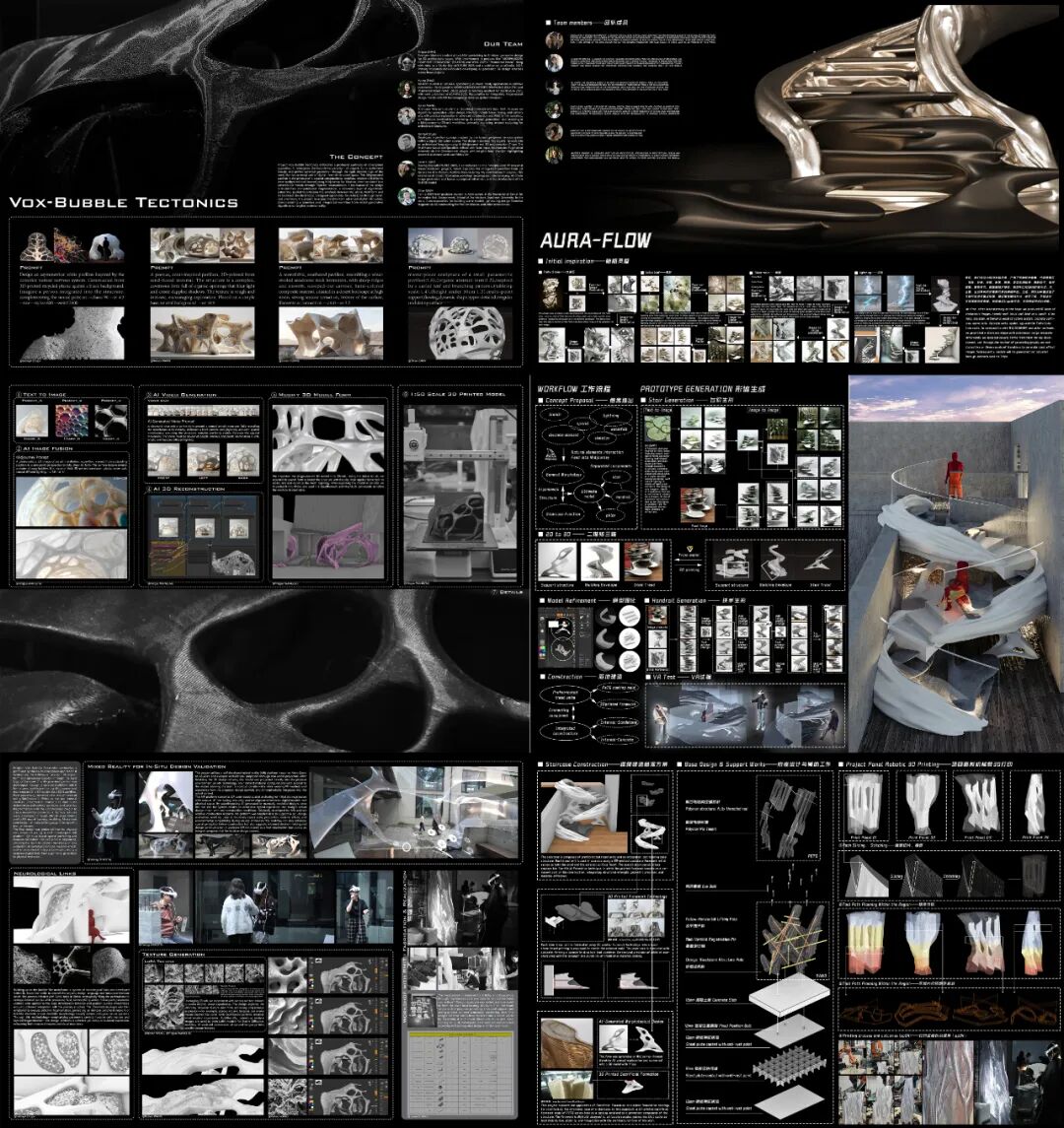 在为期三周的高强度合作中,两校学生在巴卡漫画 国际建成环境创新实验中心共同推进建造实验,成功完成了创新融合“大尺寸砂型粘结打印”与“机器人热塑颗粒增材建造”的实验性建筑构件原型。这一成果标志着国际上首次将两类大型增材制造技术协同应用于同一建构体系,综合展示了生成式 AI、复杂系统生形、材料行为模拟与智能建造技术的深度融合,是一项面向未来数字建造范式的突破性探索。