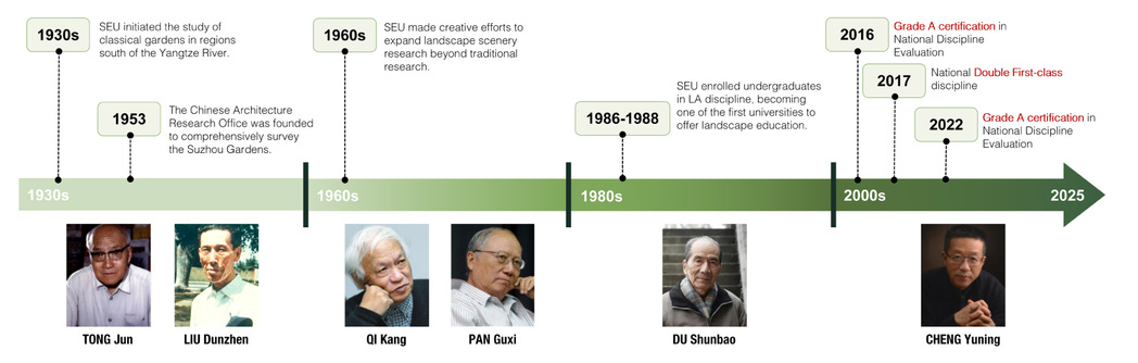 The Landscape Architecture discipline at Southeast University traces its origins to the 1930s, when Professors Liu Dunzhen and Tong Jun pioneered research into Jiangnan classical garden studies. Subsequently advanced by distinguished scholars such as Professors Qi Kang, Pan Guxi, Du Shunbao, and Cheng Yuning, the discipline has continuously innovated and expanded its disciplinary boundaries, evolving into a comprehensive academic system encompassing Landscape planning and design, Landscape architecture history and heritage preservation, Earthscape planning and ecological restoration, and Landscape architecture engineering and technology.