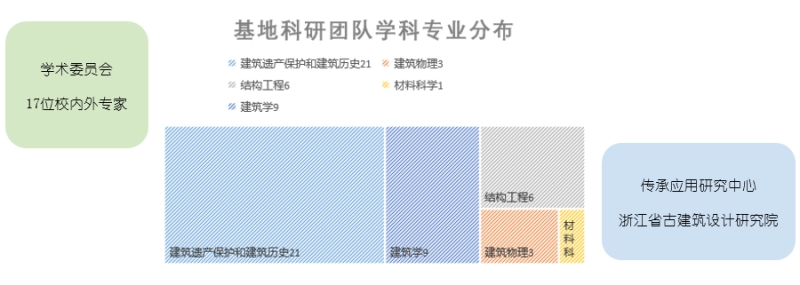 固定研究人员中,建筑遗产保护和建筑历史专业14人,建筑物理3人,结构工程6人,材料科学1人,建筑学9人,包括特邀浙江省古建筑设计研究院和中国文化遗产研究院专家各一位。其中具有博士学位的28人,教授18人(含长江学者2人),副教授11人。